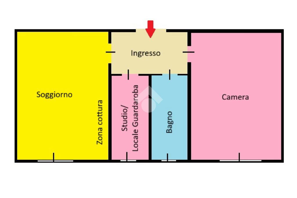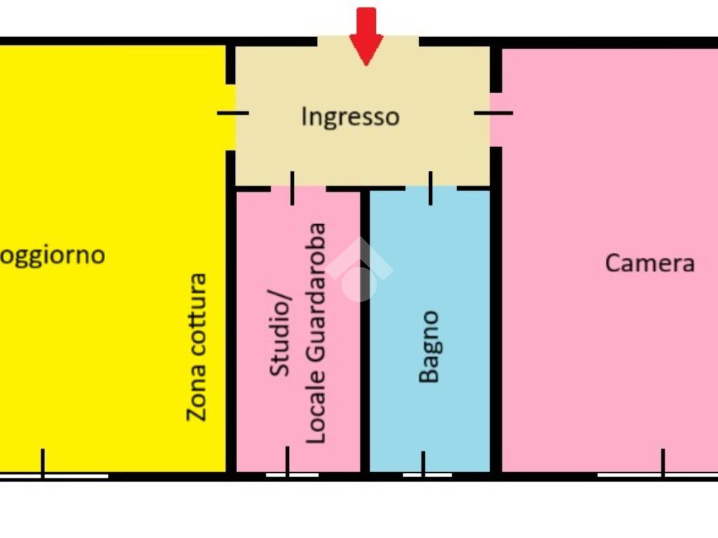 L'appartamento di 50 mq si trova al primo piano ed è composto da soggiorno con cucina a vista, studio/cameretta, bagno finestrato con vasca e doccia e ampia camera matrimoniale.