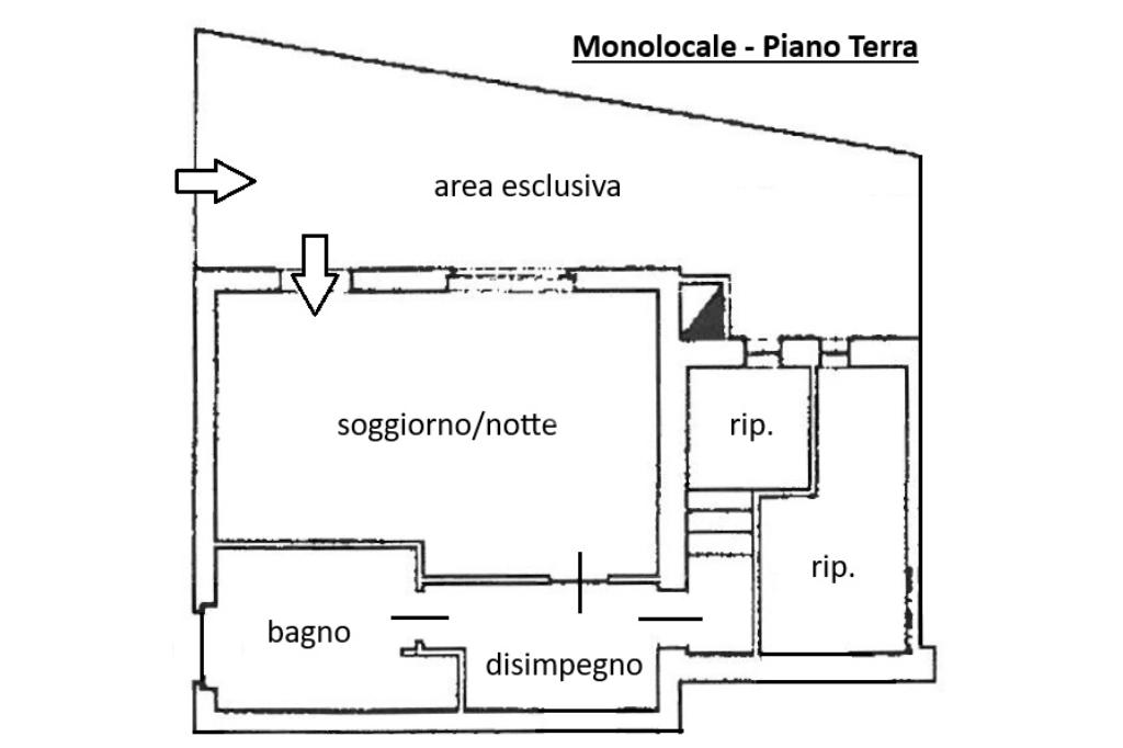 Al piano terra troviamo un monolocale di circa 61 mq. con ingresso indipendente direttamente dalla strada, adibibile sia ad abitazione che a studio professionale e composto da un ampio locale open-space, un bagno finestrato, 2 comodi ripostigli (trasformabili in cucina) e una area privata esterna fronte strada.