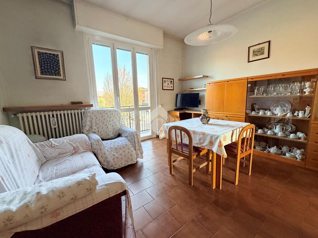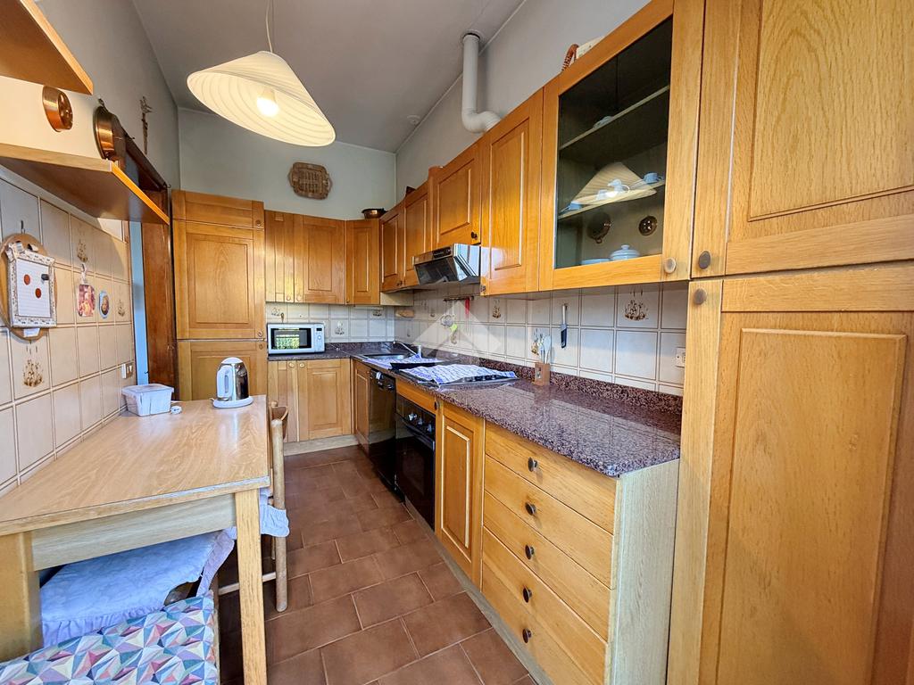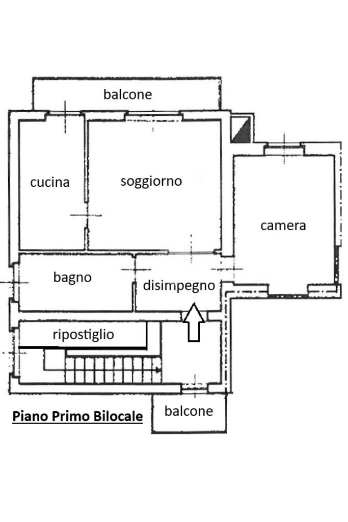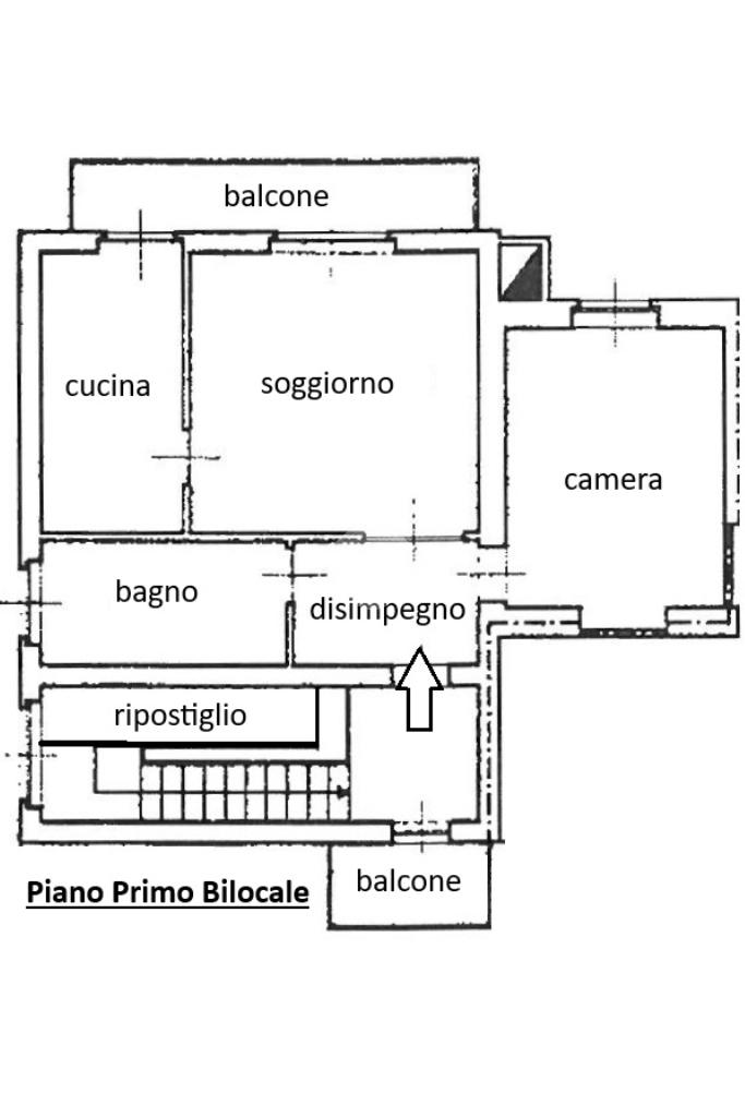 Il bilocale si apre su un disimpegno che conduce al soggiorno e alla cucina abitabile collegati entrambi da una balconata, una camera matrimoniale, un bagno con doccia e zona lavanderia. All'ingresso dell'abitazione troviamo inoltre un altro balcone e un ampio ripostiglio.